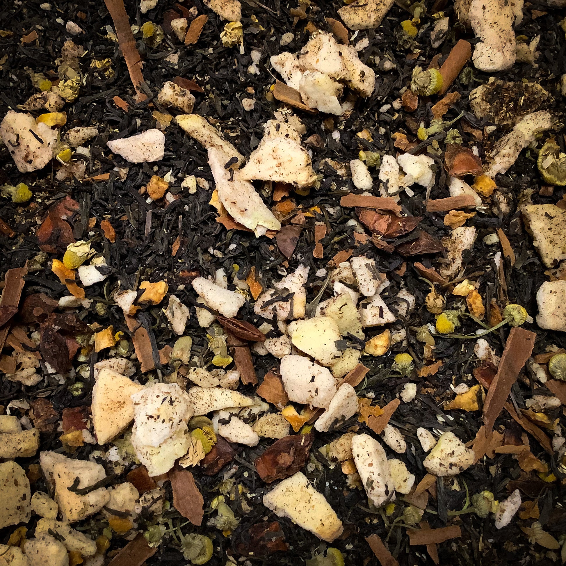 Freeze dried apples, cinnamon, chamomile, chicory, orange peel, green tea, star anise, carob, nutmeg & black tea.