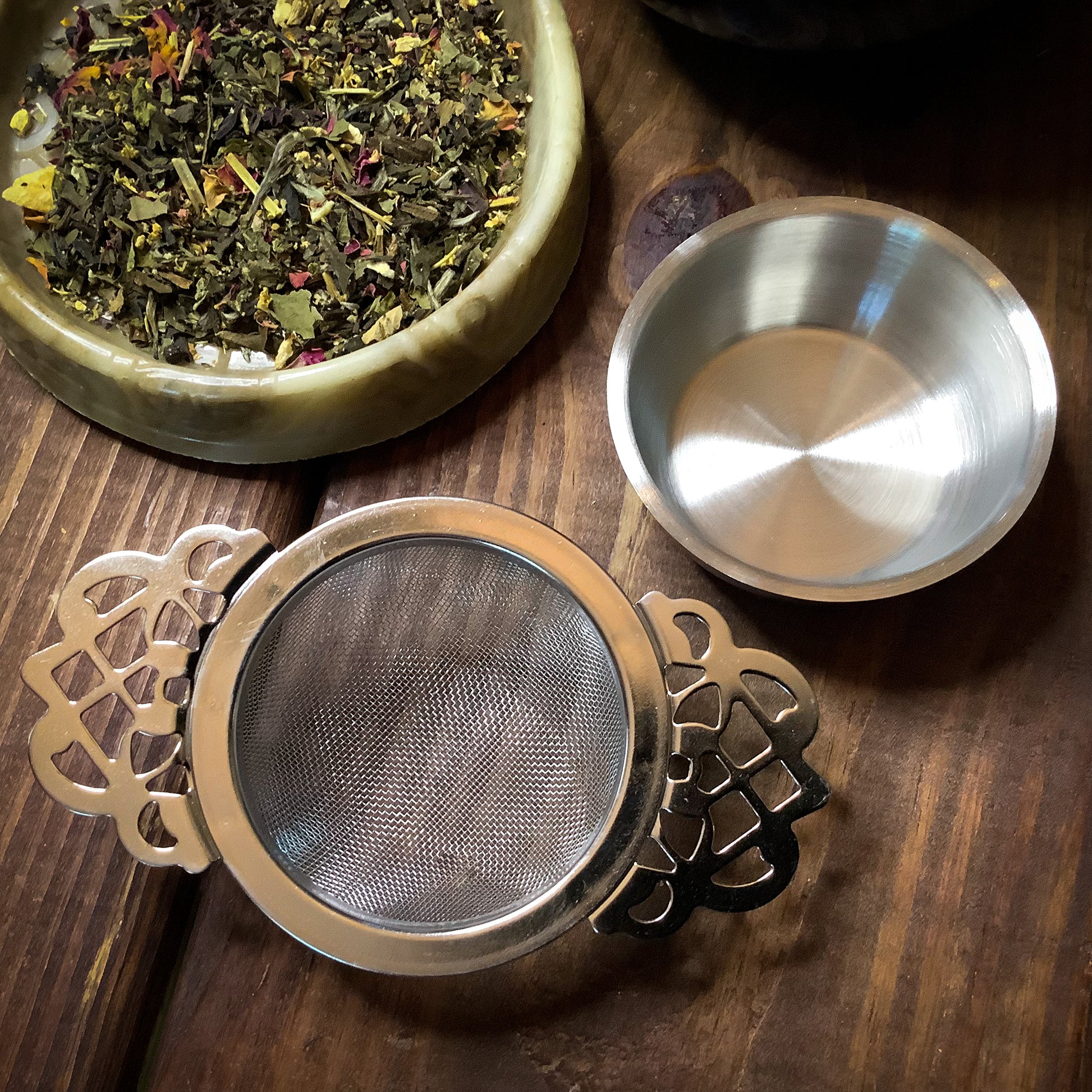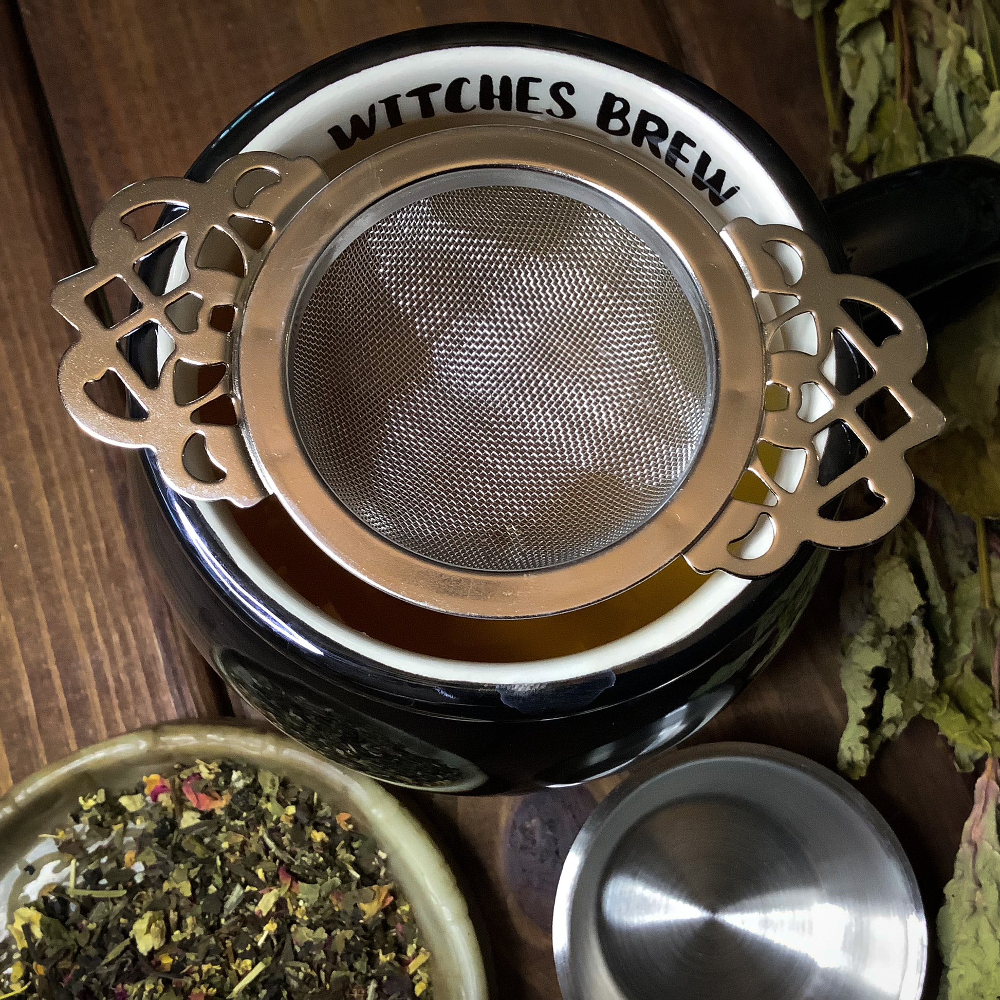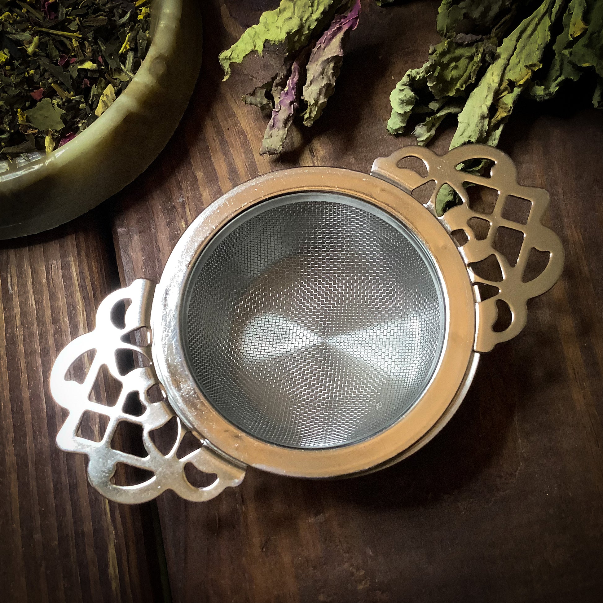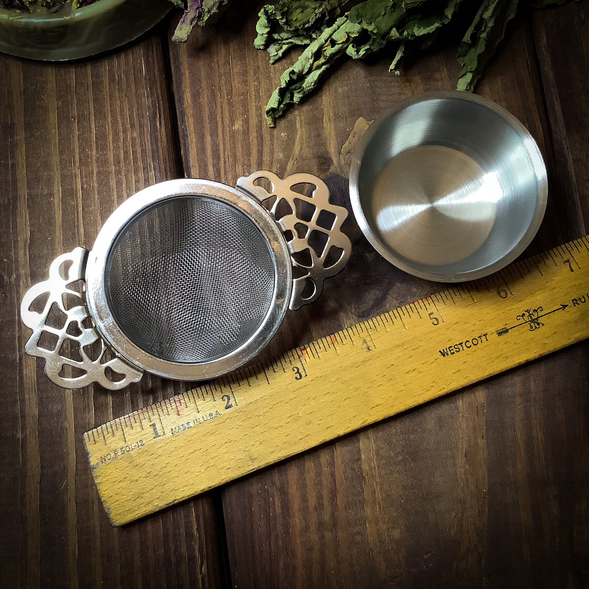 Stainless Steel 2.5" fine mesh with lace handles. Use for infusing herbs, loose leaf tea, spices and more. May be used in single cups.