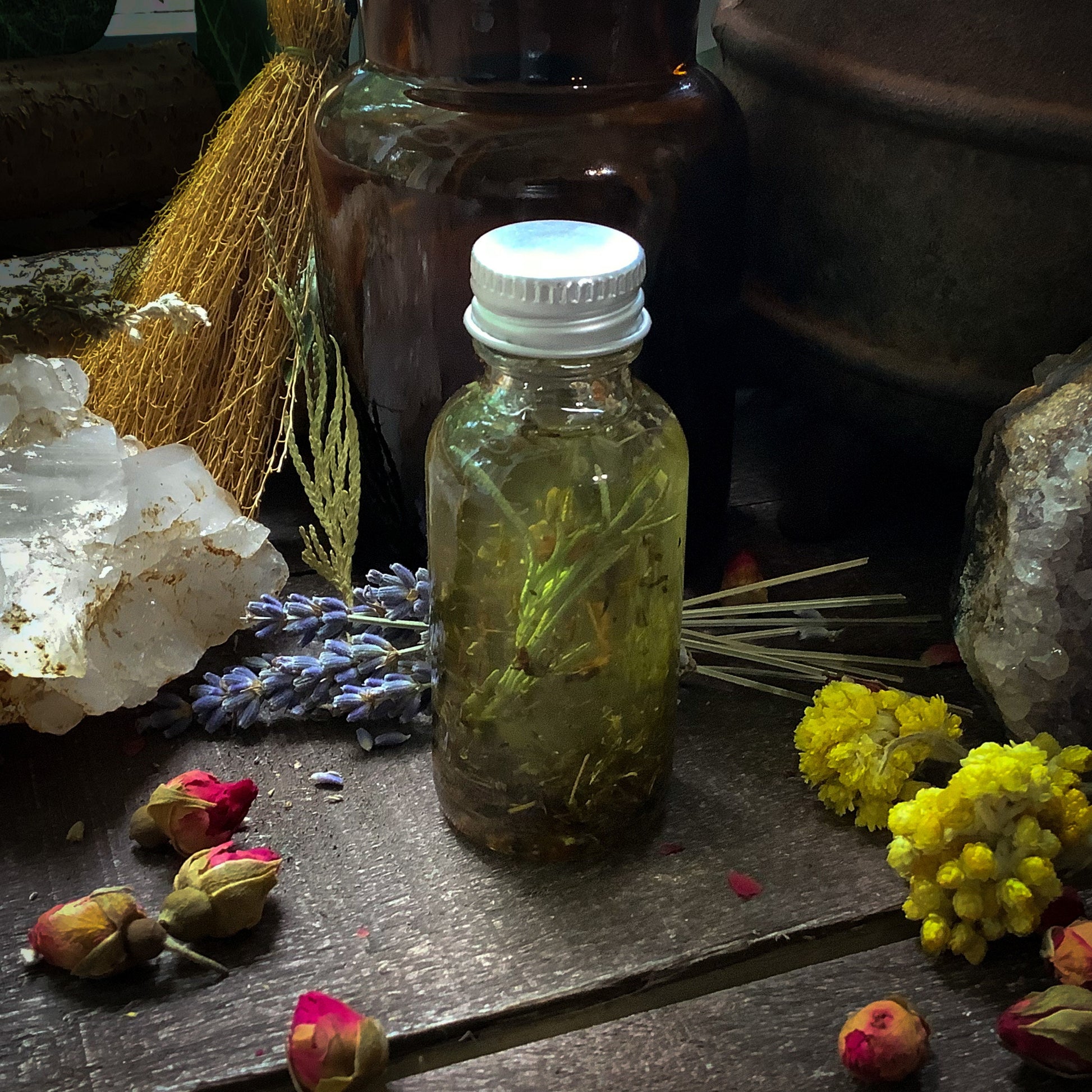 The Earth's Cauldron Anointing Oils are created with all natural base oils, pure essential oils, herbs, roots, resins, flowers and gemstones. Never any fragrance oils or synthetic ingredients. All my signature oils are 100% natural.