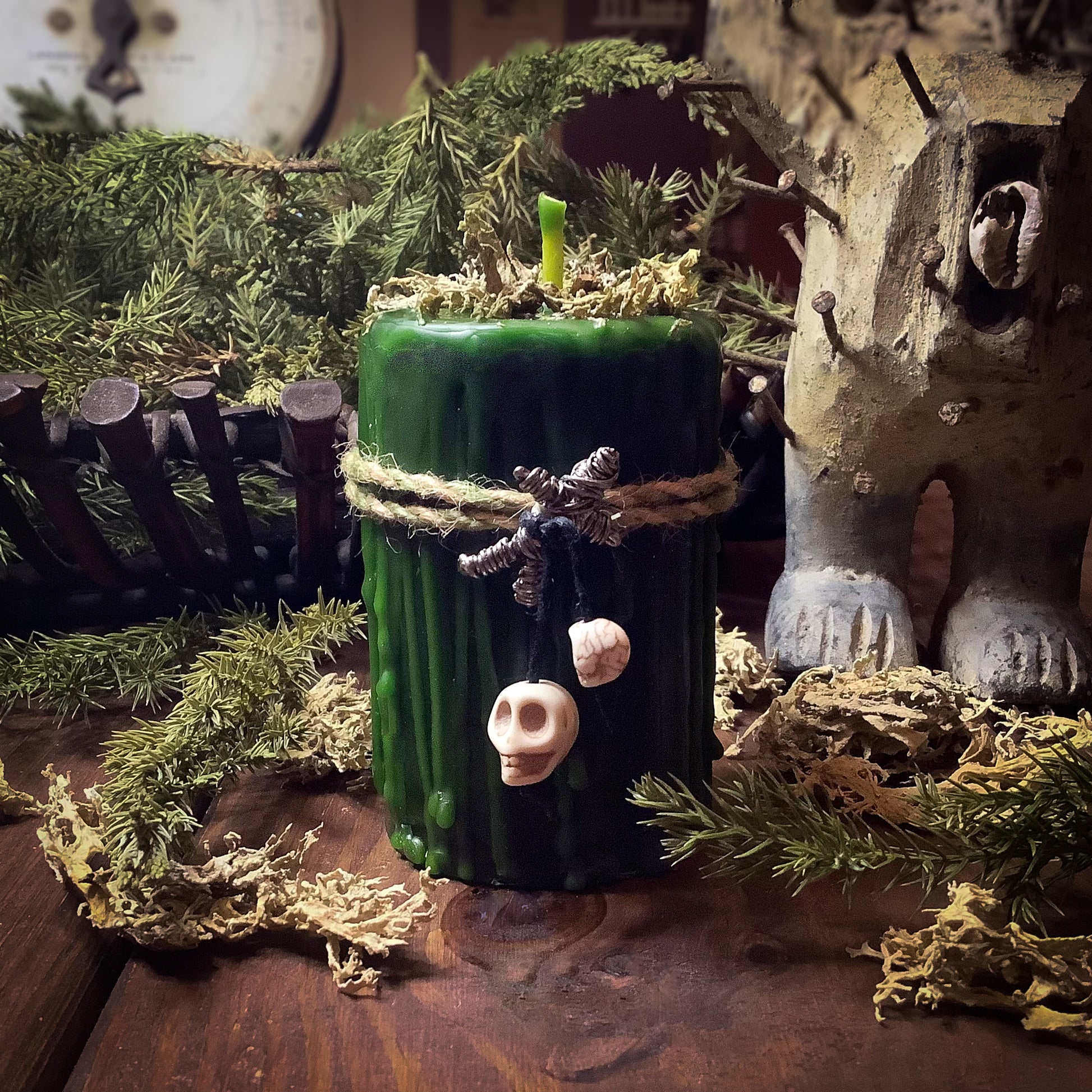 Swamp Witch ~ made with infusing beeswax with Charcoal. Scented with essential oils of Oakmoss, Lavender and Patchouli, topped with Oakmoss and cedar. Adorned with natural twine and a Voodoo Doll Charm with Howlite Skulls.